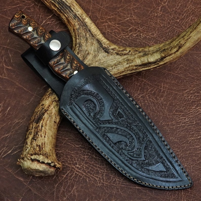 The knife comes with a custom hand-stitched leather sheath, made from thick, full-grain cowhide for durability and protection.